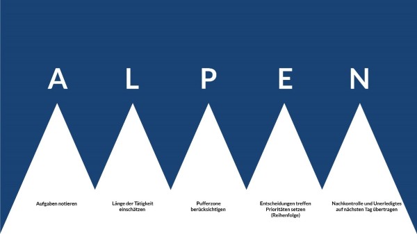 Nun, wo waren wir also? Genau, bei Phase 3. In der umfangreichsten Phase des Projekts geht es um die Umsetzung. Das Haupttool zu dieser Phase ist die ALPEN-Methode. Mit derer Hilfe kann der Zeitplan für die Umsetzung des Projekts erstellt werden. Dazu werden zuerst alle Aufgaben des Projekts aufgelistet und danach mit entsprechendem Zeitbudget in eine sinnvolle Reihenfolge gebracht.
