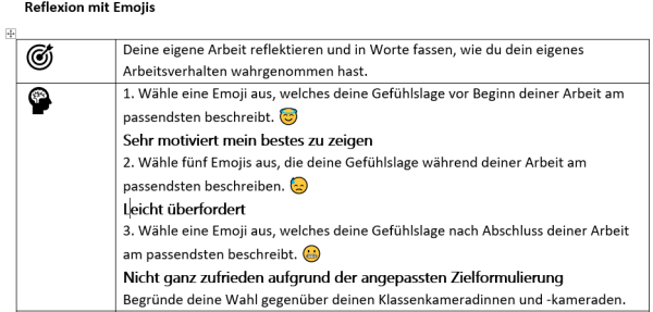 Neben aussenstehenden Personen tauscht sich auch der Projektcoach mit den Lernenden aus. Im Beurteilungsgespräch soll untersucht werden, ob und wie alle Ziele erreicht wurden, wie sich die Lernenden während der Projektarbeit gefühlt haben und was beide Parteien aus der Arbeit mitnehmen bzw. der anderen mitgeben können. Dazu gibt es sowohl ein Instrument für die Selbstbeurteilung als auch zur Vorbereitung auf das Gespräch mit einigen interessanten Inputs. Auch das Tool «Anregungen zur Reflexion der Projektarbeit» kann als Vorbereitung für das Beurteilungsgespräch gebraucht werden. Dieses Tool ist in drei Teile unterteilt. Im ersten Teil gibt es drei kurze Reflexionen, welche mit verschiedenem Hilfsmittel (Emojis, Finger und Würfel). Der zweite Teil besteht aus einem Reflexionsfragebogen und der letzte Teil beinhaltet eine Auswertung der gewonnen Erkenntnisse.