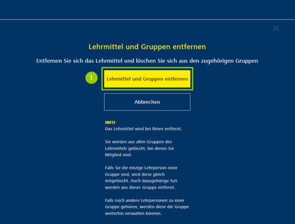 Mit der Entfernung des Lehrmittels wirst du auch aus allen Gruppen gelöscht. Falls du die einzige Lehrperson einer Gruppe bist, wird diese Gruppe gleich mitgelöscht. Auch die dazugehörigen Schülerinnen und Schüler werden aus dieser Gruppe entfernt.