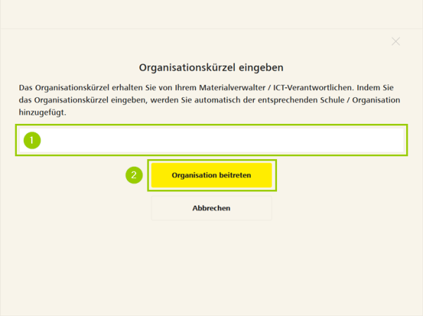 das sechsstellige Organisationskürzel ein. Du erhältst das Kürzel von deinem Materialverwalter. Klicke auf «Organisation beitreten»