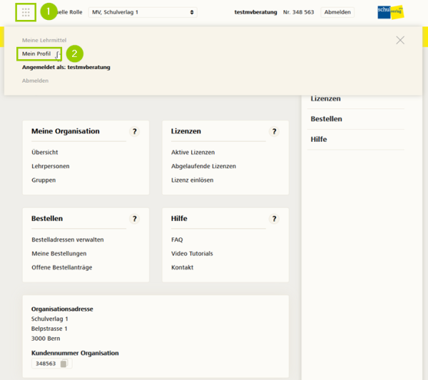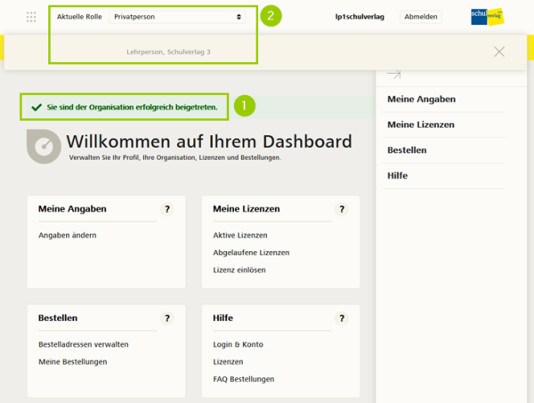 «Lehrperson» und «Privatperson» wechseln. Mit deiner Rolle «Lehrperson» kannst du nun Teilbestellungen tätigen und dir auch Lizenzen aus dem Lizenzpool deiner Organisation zuweisen. Mit einem Konto kannst du mit beliebig vielen Schulen verknüpft sein.