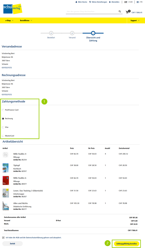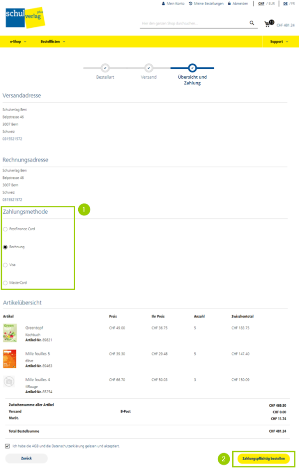 Kontrolliere deine Bestellung. Wähle die Zahlungsmethode  und sende die Bestellung mit einem Klick auf «Zahlungspflichtig bestellen»