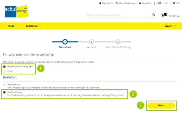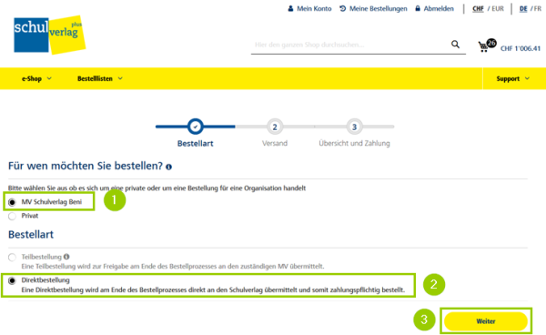 Wähle bei Bestellart «Direktbestellung»  aus. Deine Bestellung wird direkt an den Schulverlag übermittelt. Klicke auf «weiter»