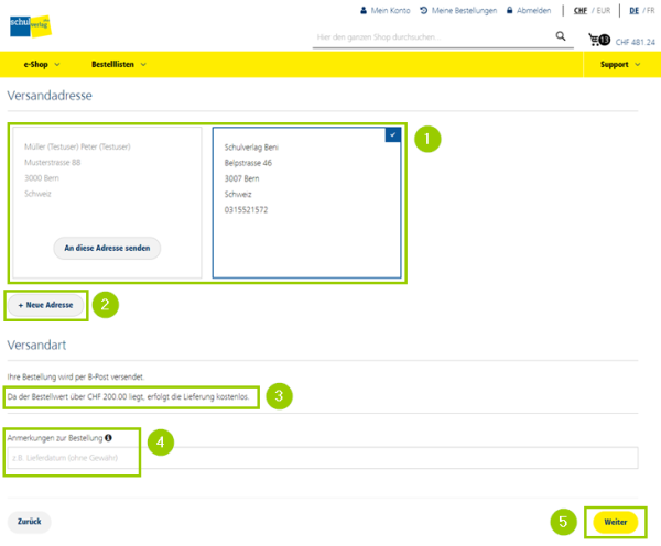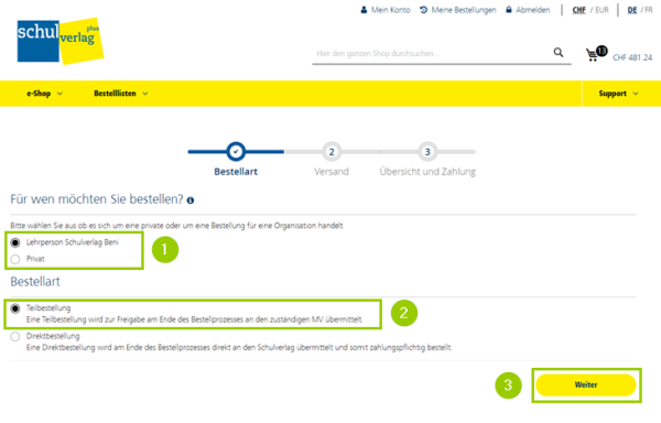 aus. Deine Bestellung wird direkt an den Schulverlag übermittelt. Klicke auf «weiter»  .
