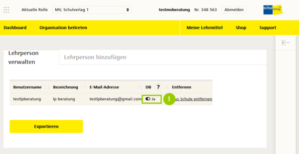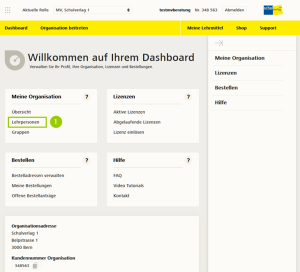 Log dich mit deinem Materialverwalterkonto auf digital.schulverlag.ch ein. Klicke in der Kachel Organisation auf «Lehrpersonen»  .
