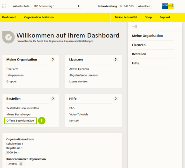 Teilbestellungen können zu einer Sammelbestellung zusammengefügt werden. Logge dich dazu mit deinem Materialverwalter-Konto auf digital.schulverlag.ch ein und klicke im Dashboard auf «Offene Bestellanträge»  .