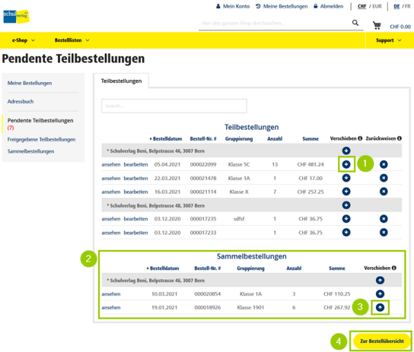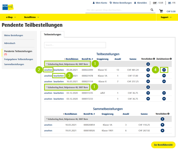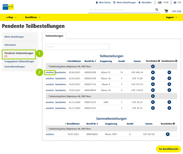 Du gelangst zur Übersicht mit allen offenen Teilbestellungen. Die Bestellungen sind nach den eingegebenen Versandadressen sortiert  . Du kannst jede Teilbestellung ansehen. Klicke dazu auf «ansehen»