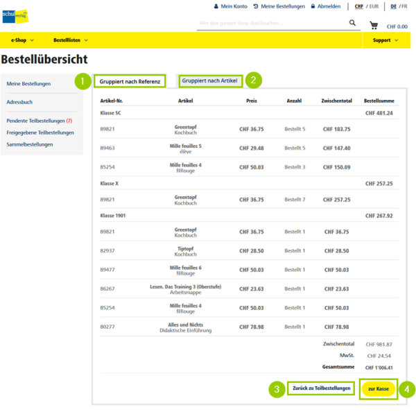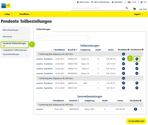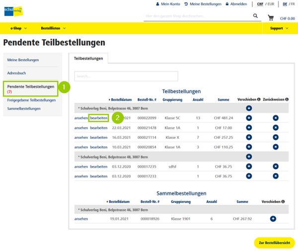 . Musst du an einer Teilbestellung noch etwas ändern, klicke auf «Zurück zu Teilbestellungen»  . Kann die Bestellung an den Schulverlag übermittelt werden, geh zur Kasse