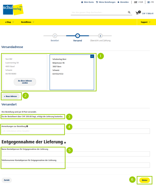 hast du die Möglichkeit z. B. ein gewünschtes Lieferdatum anzugeben. Für die Entgegennahme der Lieferung  kannst du eine Kontaktperson angeben. Klicke nun auf «Weiter»