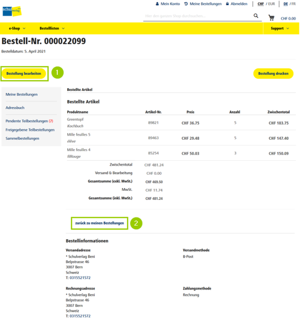 Wenn mit der Teilbestellung alles in Ordnung ist, klicke auf «zurück zu meinen Bestellungen»  . Du hast aber auch die Möglichkeit die Teilbestellung zu bearbeiten