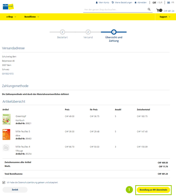 . Kann die Bestellung an den Schulverlag übermittelt werden, geh zur Kasse  .