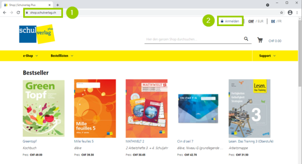 Öffne unseren Shop unter shop.schulverlag.ch  und klicke auf «Anmelden»