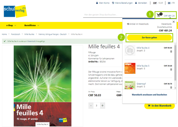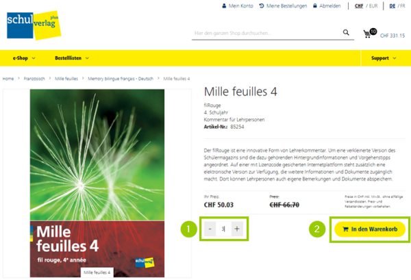 Lege nun deine gewünschten Produkte in den Warenkorb. Tippe dazu die benötigte Anzahl  ein und klicke auf «In den Warenkorb»