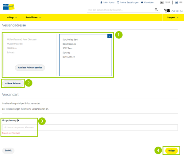 . Im Feld «Gruppierung»  tippe z. B. deinen Namen oder die Klasse ein. Diese Information wird auf den Lieferschein gedruckt und wird für die korrekte Aufteilung der Lieferung benötigt. Klicke nun auf «Weiter»