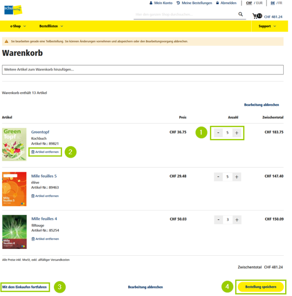 Dir wird der Warenkorb der Teilbestellung angezeigt. Du kannst deine gewünschten Änderungen vornehmen: Anzahl anpassen  , Produkt entfernen
