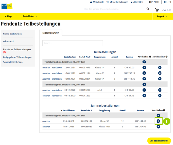 Ist die Teilbestellung bereit zur Übermittlung, kann Sie zur Sammelbestellung verschoben werden. Klicke  bei der gewünschten Teilbestellung auf «Verschieben»  . Die Bestellung ist nun unten in der Rubrik Sammelbestellungen